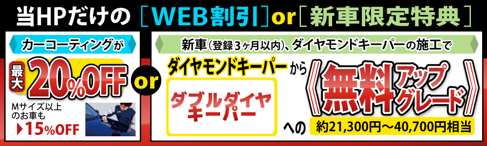 新車(登録して3ヶ月以内)にダイヤモンドキーパーを施工される方には、同料金にてダブルダイヤキーパーにランクアップさせて頂きます。